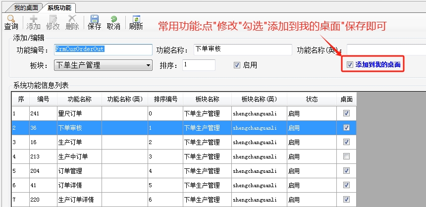 b,选中功能,点修改,勾选"添加到我的桌面"保存.