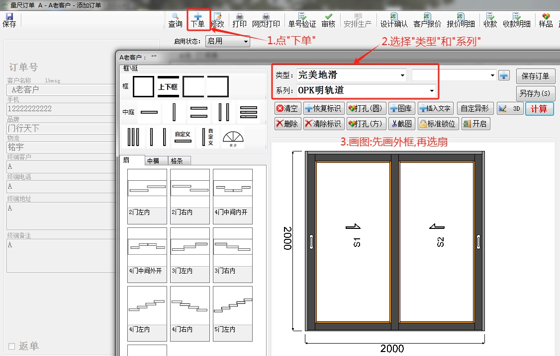 3.下单:先类型和系列再画图(先画外框,有固定副窗选中庭,然后选扇;如有中横或格条,选区域后画中横或格条)