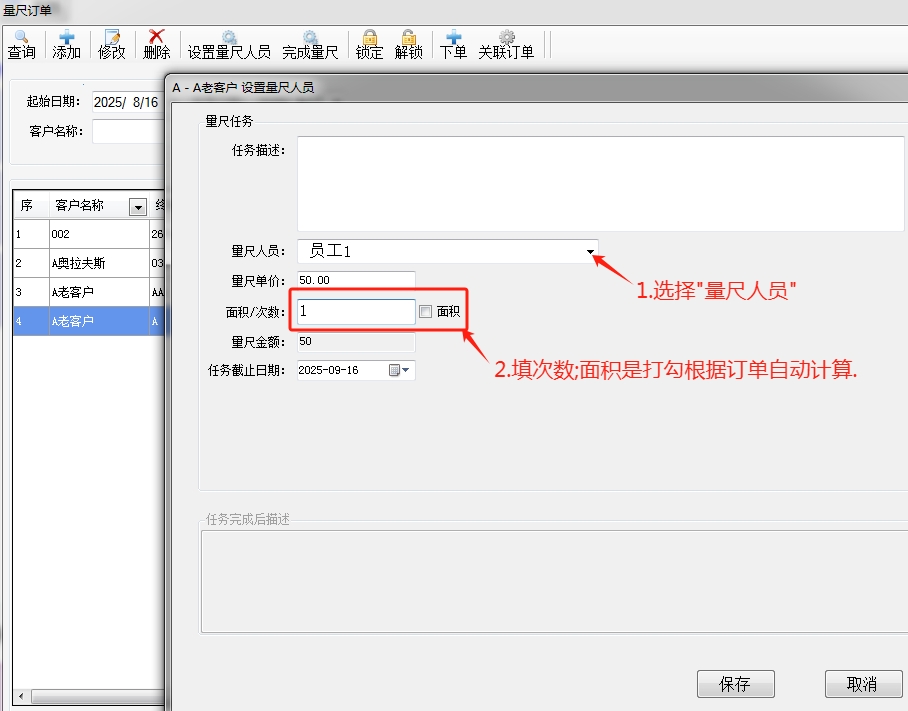 2.保存客户信息后,设置量尺人员及完成量尺.